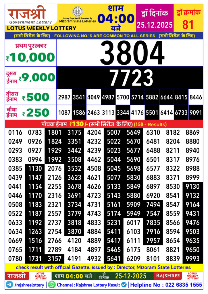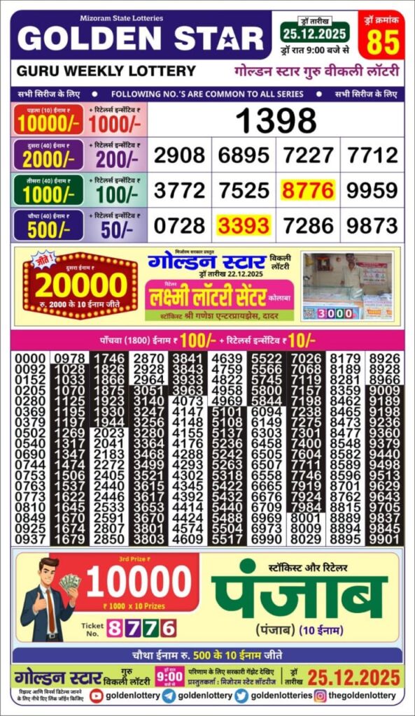 गोल्डन लाटरी का रात 9 बजे का रिज़ल्ट दिनांक 25.12.25