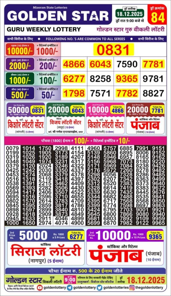 गोल्डन लाटरी का रात 9 बजे का रिज़ल्ट दिनांक 18.12.25