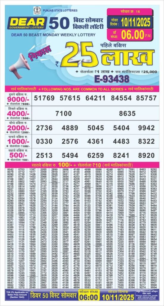 डिअर लाटरी का रात 8 बजे का रिज़ल्ट दिनांक 10.11.25