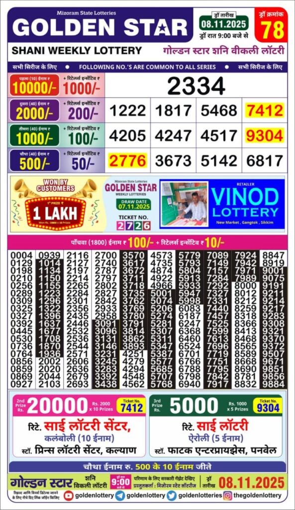 डिअर लाटरी का 1 बजे का रिज़ल्ट दिनांक 09.11.25